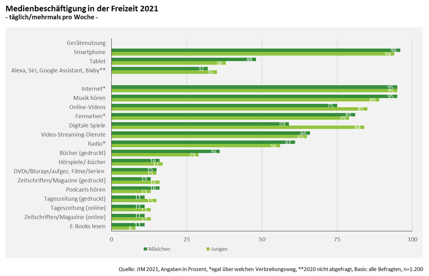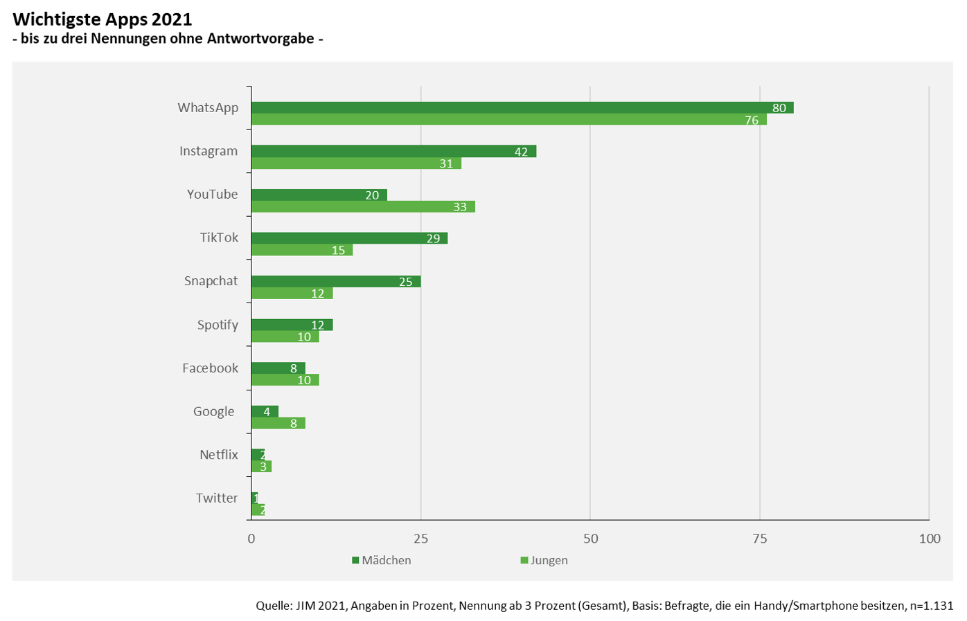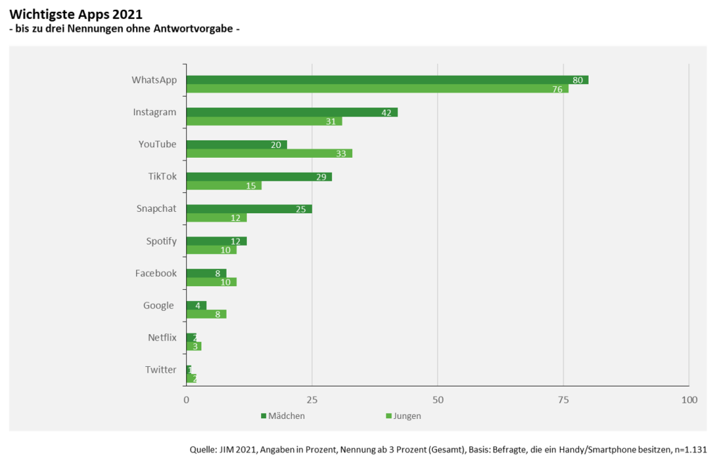Die wichtige Gruppe der jugendlichen Nutzer*innen etwa partizipiert immer weniger am linearen Programmangebot der etablierten Fernsehsender, was ein Blick in die JIM-Studie 2021 Jugend, Information, Medien des Medienpädagogischen Forschungsverbunds Südwest zeigt. Internetangebote prägen die Medienbeschäftigung der Jugendlichen, dabei aber vor allem auch solche des delinearen Fernsehens: 66 % der 12- bis 19-jährigen Mädchen und 65 % der Jungen nutzen täglich oder zumindest mehrmals die Woche Streaming-Dienste wie Netflix, Amazon Prime oder Disney+, und sogar 75 % der Mädchen bzw. 85 % der Jungen Online-Videos auf Plattformen wie YouTube, was direkt nach WhatsApp und Instagram zur wichtigsten App der Jugendlichen gehört. Dass Fernsehen auch weiterhin hoch im Kurs der Jugendlichen steht (81 % der Mädchen und 79 % der Jungen) ist nicht verwunderlich, denn bei der Befragung wurde kein Unterschied gemacht, über welche Plattform bzw. ob lineares oder delineares Programm geschaut wird.