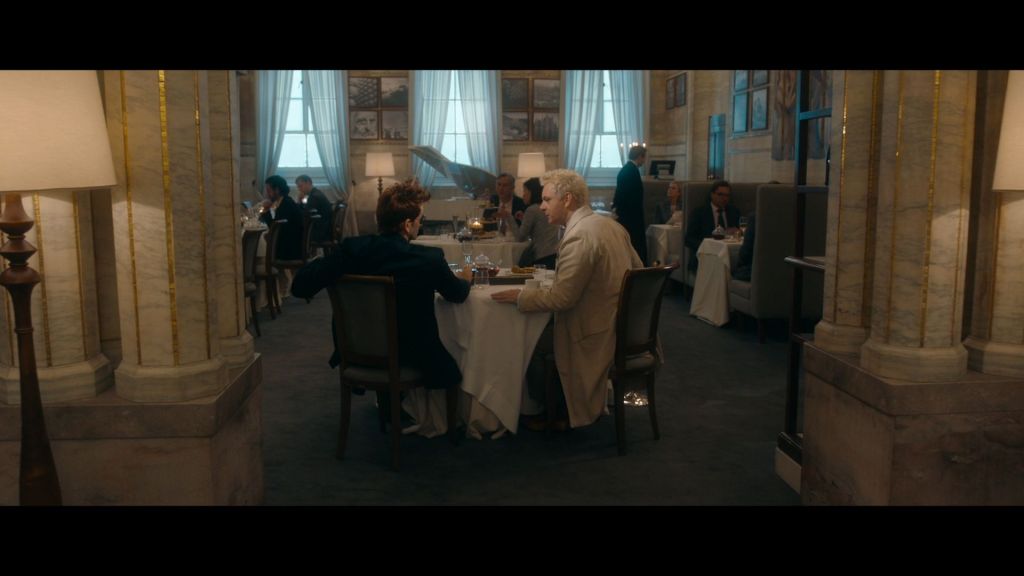 One other example: In the very last sequence, Crowley and Aziraphale have lunch together after the earth is saved. After they toast „to the world,“ Aziraphale again keeps gazing at Crowley with heavy breathing. Crowley and Aziraphale having lunch, dinner, or late night drinking sessions are also „Activities Associated With Dating“ that Winkle mentions. Besides the gazing, the set design also gives the spectator the impression that they are on a date – like candles suggesting a candlelit dinner, or the fact that they drink wine and champagne.