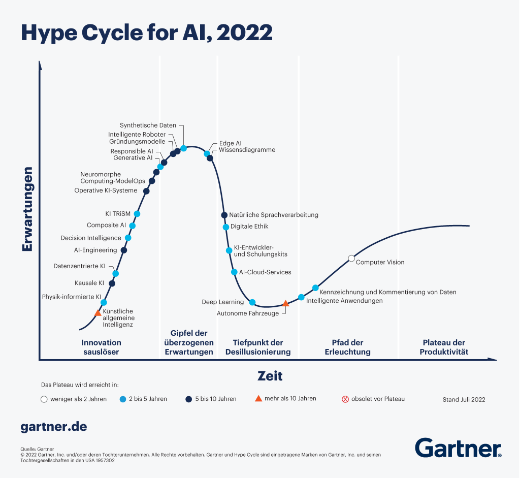 Abbildung 1: Gartner Hype Cycle für Künstliche Intelligenz 2022, https://www.gartner.de/de/artikel/gartner-hype-cycle-2022-zum-thema-ki