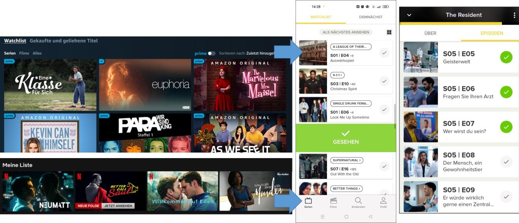 Angetrieben von den Streaming-Diensten und vermittelnden Instanzen auf den sozialen und Videosharing-Plattformen, ist derzeit eine schiere ‚Explosion‘ der Fernseh-Listenkultur zu beobachten. Watchlisten auf Netflix und Co. sowie die Empfehlungen aus dem Metaverse, YouTube oder TikTok bereiten meinen Serienkonsum als To-dos vor, die ich noch zu sehen=erledigen habe. Über alles, was ich bisher schon gesehen=abgearbeitet habe, kann ich wiederum hinterher ‚Buch führen‘. Mit Apps wie SeriesGuide oder TV Time kann ich Inventarlisten erstellen, Sichtungen planen und meine Leistungen feiern – sprich: ‚eigeninitiativ‘ an meiner eigenen Serien-Biografie und meinem Fernseh-Ich zu arbeiten. Die Kultur des „playlisting“, in der User:innen als aktive Kurator:innen und ‚Supervisor‘ des eigenen Medienkonsums auftreten, wird auf diesen Apps transparent. Im Zusammenhang mit Online-Fernsehen und Video-Streaming ist vielfach vom „Pull-Modell“ die Rede: Mediennutzer:innen ‚ziehen‘ sich den gewünschten Content von Anbietern, anstatt dass letztere ihn einseitig ‚pushen‘. Anne Gilbert (2019) merkt jedoch an: „pull is labor […] labor that must be continually renewed and reviewed“. Durch die ständige Arbeit am individuellen TV-Programm, wechseln Zuschauende fast unmerklich in die Rolle von Mitarbeitenden in einer Rezeptionsleistungsgemeinschaft, in der es immer um das Abhaken von To-dos, effiziente Seriensichtungen und die nächste (Binge-)Aufgabe geht. Apps wie SeriesGuide und TV Time unterstützen dieses Sich-an-Serien-abarbeiten ausdrücklich. So wird TV Time beworben als „the tool you need to help you keep track of all the shows you love“ – ein Arbeitswerkzeug also, um meine Fernsehtätigkeit zu professionalisieren. Was unzweifelhaft ein Hilfsmittel ist, um angesichts der anhaltenden Flut an Serien und anderem TV-Content den Überblick zu behalten, ist zugleich ein weiterer Daten-Aggregator.