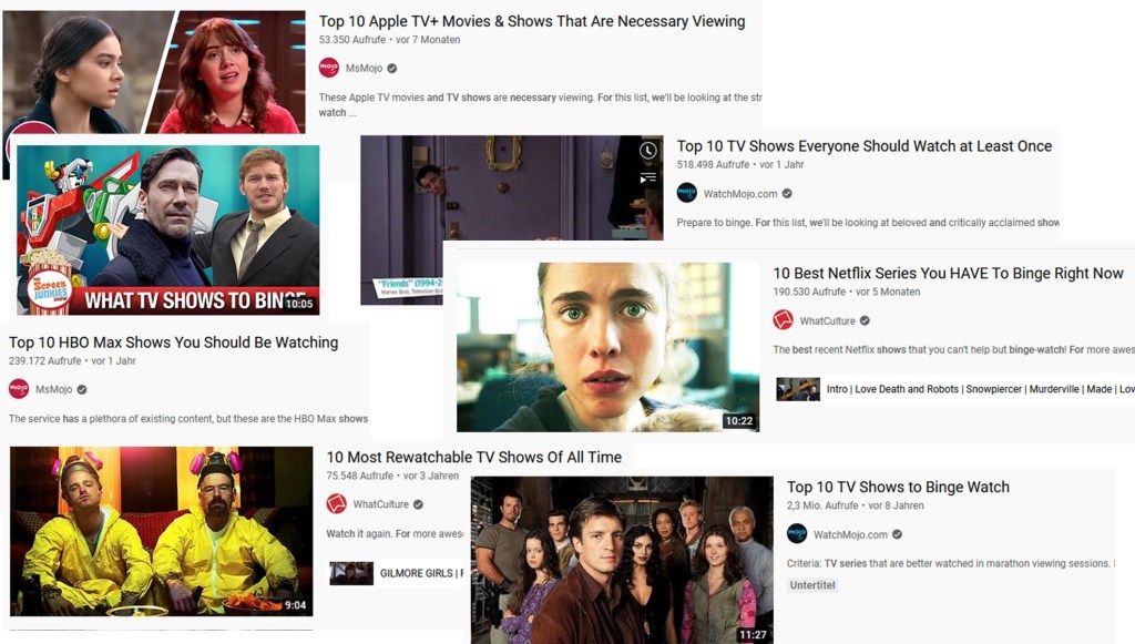 Das heutige (Web-)TV-Publikum ist weniger bedeutungsproduzierend (nach John Fiske) als vielmehr datenproduzierend. Und diese (Sichtungs-)Daten, wie bspw. Genre-Präferenzen, wiederholte Sichtungen, Wochenend-Binges oder abgebrochene Serien/Episoden, werden prompt in neue Watchlisten oder Empfehlungen umgewandelt – alles natürlich im Rahmen der „freiwilligen Selbstverpflichtung“. Dieser kulturpraxeologische Wandel der Fernseh(serien)rezeption geht weit über die eigentlichen Streaming-Plattformen hinaus. Die ‚Arbeitsmoral‘ verschiebt sich von Terminen einhalten zu Listen abarbeiten, nicht zuletzt auch durch zusätzliche Empfehlungen von Zwischenmittlern auf Social Media. Unzählige YouTube-Channels veröffentlichen quasi täglich Top10-Listen mit Serien, „die man jetzt bingen sollte“ oder „die jeder gesehen haben sollte“ (z.B. WatchMojo); Content-Creator auf TikTok fassen wöchentlich ihre jüngsten Serienerlebnisse zusammen, „die es wert sind, gebingt zu werden“ (z.B. @365binge). Mit der Vorgabe von Listen werden TV-Zuschauende animiert oder sogar unter Druck gesetzt, eigene Listen zu erstellen, um ihren Fernsehkonsum zu strukturieren. Das Phänomen ist Teil der umfassenden „Listen-Kultur“ („listicle culture“) des 21. Jh., wie sie Liam Cole Young (2017) beschreibt. Als Tools zur Organisation von Arbeit, zum Instruieren und Erteilen von Aufträgen sowie zum Erfassen und Überwachen von Daten schreiben Listen die ertrags- und leistungsorientierte, gewinnmaximierende Arbeitskultur in die digitale Medien- und Freizeitkultur ein.