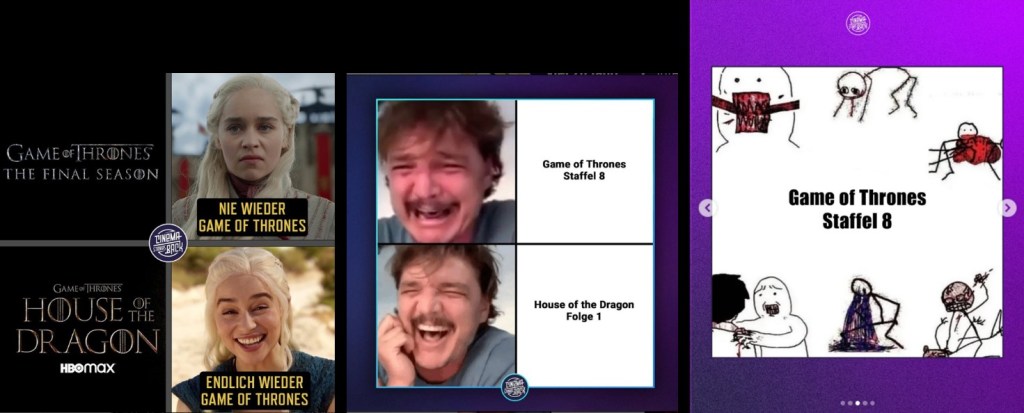 Grundsätzlich produziert Fernsehen regelmäßig ‚meme-fähige‘ Inhalte. Seine Alltäglichkeit, Periodizität und Serialität sieht sich in Memes gespiegelt, weshalb sowohl TV-Serien als auch Memes zu ständigen Begleitern in der digitalen Medienkultur geworden sind (vgl. Zündel 2025); insbesondere auf Plattformen wie Instagram und TikTok, die audiovisuelle Inhalte in memetischer Form weiterverarbeiten. Dabei scheinen die Meme-Posts an Episoden-Staffel-Strukturen angelehnt. Sogenannte Carousel Posts auf Instagram (mit bis zu 20 Bildern pro Beitrag) lassen sich als episodenseriell beschreiben, wenn etwa mehrere Variationen derselben Meme-Vorlage (template) auf einen Schlag veröffentlicht werden. Zugleich ähneln sie den full-season-drops, also vollständigen Staffelpublikationen auf Netflix und Co. Auf TikTok werden Video-Memes ähnlicher Form oder Machart (z.B. Reenactments von TV-Szenen) häufig in Playlisten und damit für den Binge-Konsum angeordnet. Speziell mit Sitcoms haben Memes weitere Gemeinsamkeiten, die zur Wiedererkennbarkeit und einfachen, schnellen Konsumierbarkeit von Memes beitragen: die typische Struktur von Witzen – bestehend aus Set-up und Punchline – und den Einsatz von Running Gags. So weisen die Content-Creator:innen des funk-Angebots Cinema Strikes Back in diversen Meme-Posts auf Instagram (@cinemastrikesback) immer wieder auf ihren Unmut gegenüber der finalen Staffel von Game of Thrones hin.