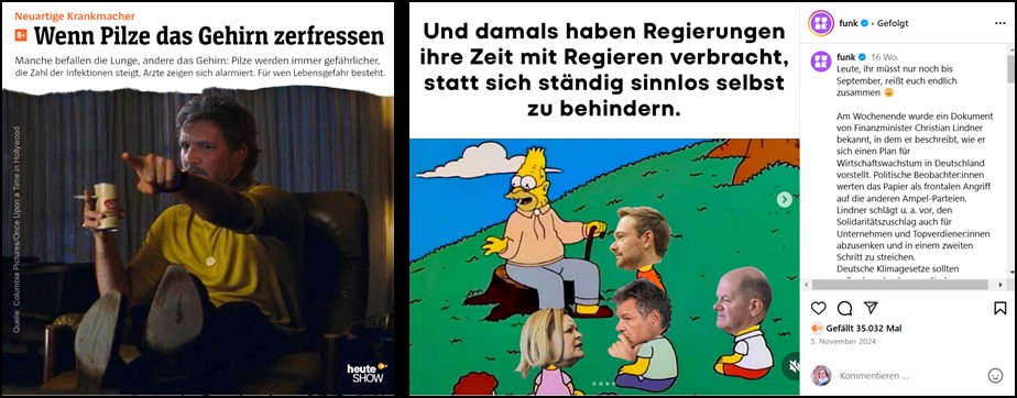 (eigene Scrteenshots, Bildquellen: ZDF heute.show [Facebook]; funk [Instagram], Zugriff am 05.03.2025.)