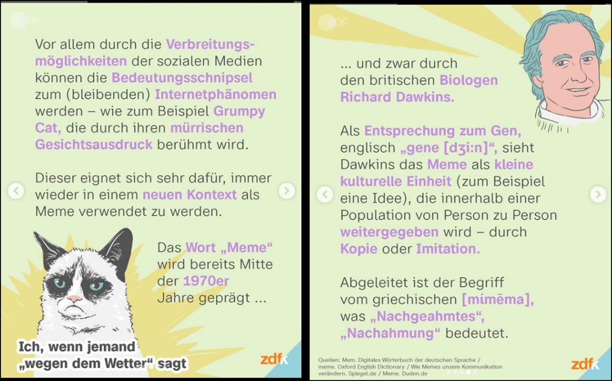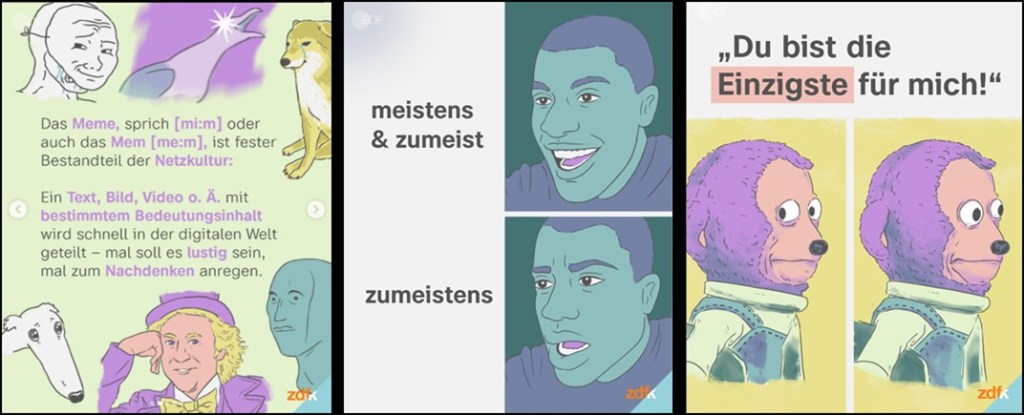 Die Social-Media-Verlängerungen des ÖRR nehmen sich also der digitalen Umgangssprache von Memes an. Allerdings fallen die autorisierten Memes von ARD, ZDF und Co. eindeutig unter eine professionalisierte, weil standardisierte und routiniert verwendete Handelssprache, die von klassischen Medien erlernt wurde. Typische Meme-Genres wie Panel-Memes (zwei nebeneinander gestellte Bilder und Aussagen) oder Label-Memes (mehrere beschriftete Elemente in einem Bild) sind in das Grundvokabular der öffentlich-rechtlichen Social-Media-Outlets eingegangen (s.o.). Dabei sind Layout und Typographie dieser ‚offiziellen‘ Memes an das Corporate Design des jeweiligen Senders oder TV-Formats angepasst, das verbreitete image-macro-Format (eigentlich durch die Schriftart „Impact Font“ und nicht unbedingt hochaufgelöste Bilder charakterisiert) also dem neuen institutionellen Kontext anverwandelt. Ein top-down-Meme ist somit immer eindeutig als solches markiert – und dennoch stets als ‚Meme‘ erkennbar, nicht zuletzt, weil meist populäre Meme-Vorlagen (templates) verwendet werden. So verwendet bspw. der Instagram-Account von ZDFkultur (@aroundtheworld) bekannte Motive wie Doge, Grumpy Cat, Willy Wonka oder Wojak, abstrahiert und stilisiert diese im Design seiner Posts (s.u.). Tatsächlich entspricht dieses Vorgehen auch der kulturellen Praktik des memeing (Pauliks 2022), d.h. dem ständigen Umdeuten, Umgestalten und Wiederanwendens audiovisueller ‚Schnipsel‘ auf neue Situationen und Sachverhalte. Im Zusammenhang mit televisuellen oder fernsehverwandten Inhalten, finden diese bekannten Memes weitere Gebrauchs- und Verwertungskontexte – oftmals mit einem politischen oder kulturspezifischen ‚Zuschnitt‘. Im Falle von ZDFkultur dienen Memes der Auseinandersetzung mit und Kommentierung von linguistischen Phänomenen, Sprachgebrauch und kulturellen Eigenheiten.