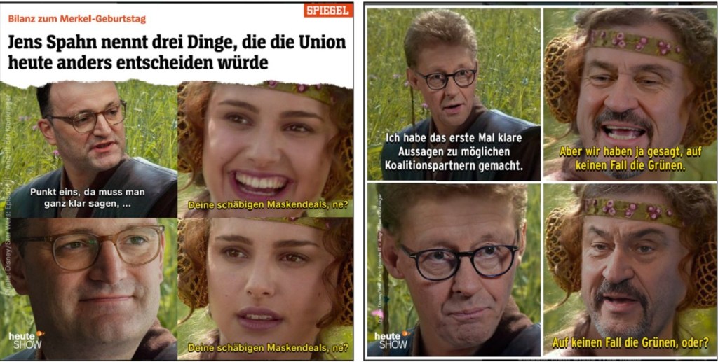 - das „Anakin and Padme 4 Panel“-Meme, das üblicherweise dafür genutzt wird, unterschiedliche Einstellungen, Intentionen oder Erwartungshaltungen zwischen zwei Parteien darzustellen (vgl. Know Your Meme). Die Satiresendung publizierte Variationen dieses Memes, die auf Meinungsverschiedenheiten und Uneinigkeiten innerhalb der CDU anspielten (siehe unten).