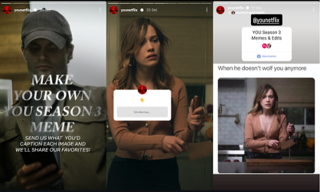 Die Transmedia-Kampagne der finalen Staffel YOU stellt diese Erwartungen und Anbindungsformen plakativ aus. In den Stories lädt der Instagram Account der Serie aktiv zur Produktion von Memes ein. Die Vorauswahl der Meme-Vorlagen besteht aus Stills der vergangen vier Staffeln der Serie. Der Plan geht auf, denn die Vorlagen werden erweitert, Variationen entstehen und zirkulieren auch außerhalb des offiziellen Accounts auf diversen Fansites.