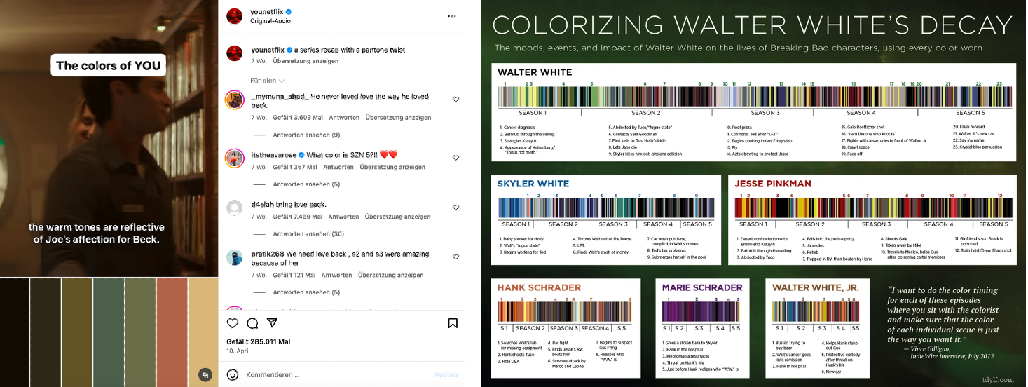 links: Instagram Posts vom 10.04.2025, younetflix, https://www.instagram.com/p/DIwoKcauWMa/, Zugriff am 02.06.2025 | rechts: Breaking Bad Wiki, https://breakingbad.fandom.com/wiki/Colors, Zugriff am 02.06.2025