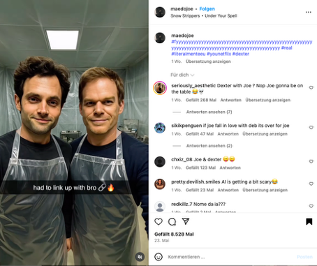 Durch die Plattformisierung erfahren serielle Fragmente eine Rekontextualisierung, bei der eine Wechselwirkung von alt und neu beobachtet werden kann. Nostalgische Serienklassiker erleben durch Plattformisierung eine Renaissance, indem algorithmisch verbreitete Clips neue Zielgruppen erreichen und die Serie im digitalen Raum aktualisieren. Diese Aktualisierung und Aneignung findet zum Beispiel in Form von Memes und Remixes statt. Durch die Modularisierung werden abgeschlossene Serien in neuen Kontexten weitergespielt und verändern ihre ursprüngliche Bedeutung. Durch Duett-Videos oder Stitching wird die Zusammenführung von alt und neu in einer einzelnen Kachel zusammengeführt und visualisiert dabei plakativ die rekursiven Aushandlungs- und Anbindungslogiken. Mit KI-generierten Inhalten werden Remix- und Mash-Up-Praktiken abermals transformiert und generieren dadurch wieder neue Formen der Zusammenführung, Aktualisierung und Aneignung von Serieninhalten. So treffen die Serienkiller Joe Goldberg (YOU, Netflix, 2018-2025) und Dexter Morgan (Dexter, USA, Showtime, 2006-2013/ Dexter: New Blood, USA, Showtime, 2021-2022) in diesem Bild aufeinander und laden damit zur Verbindung beider Storyworlds und zur Fortschreibung ihrer Narrative ein.