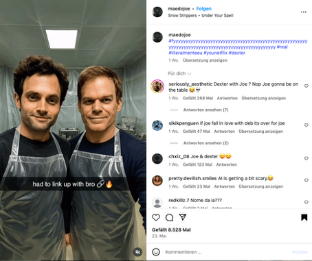 Im nächsten Post ranked Hauptdarsteller Penn Badgley „10 of the wildest Joe Goldberg moments up to season 5“ und präsentiert damit eine Recap-Variation, die die Serie fragmentarisiert, aktualisiert, als Snippets neu anordnet und dabei neue Anbindungsmöglichkeiten erschafft.